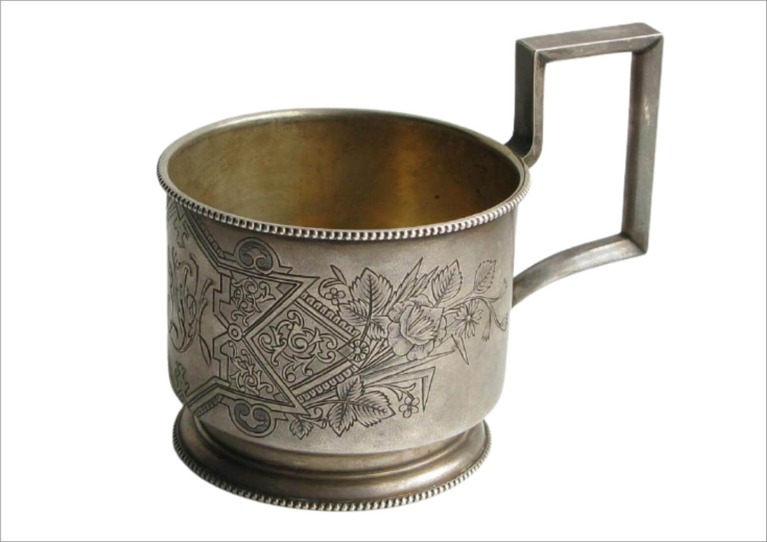 Каждый подстаканник или портсигар того времени обладает особым очарованием. Историческая значимость таких вещей доказывается при наличии клейма на колечке или ноже. Например, если на них указана 84 проба, значит в сплаве есть серебро и медь (соотношение 84:12) и он устойчив к внешним воздействиям. Такой материал часто использовался в домах, чьи хозяева имели высокий социальный статус.